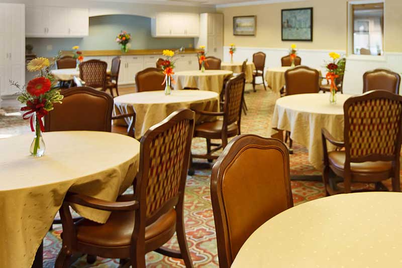 Our food service director works closely with our registered dietitian to promote optimal nutrition as a vital component to maintaining good health. A diverse menu designed to meet the individual needs of every patient is provided. Social dining is offered and encouraged. The main dining room is open for all meals, including a hot breakfast buffet on weekdays.